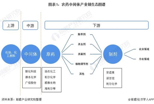 农药中间体上游是黄磷、液氯等无机原料,和甲醇三苯等基本有机原料(统称为石油/化工原料),原药合成与制剂加工构成农药产业链下游,由农药原药加工成的制剂应用于农业与非农领域。