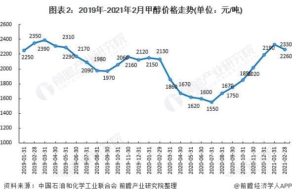 2020年2月起,甲醇价格呈现下跌态势,至2020年7月止跌回升。2021年1月,甲醇价格上升至阶段性高点2330元/吨,2021年2月,甲醇价格小幅下滑至2260元/吨。