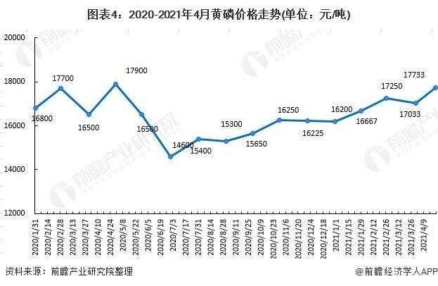 2020年4月起,黄磷价格呈下跌趋势,2020年6月起黄磷价格企稳,进入上升通道。2021年,受黄磷企业停检、原料磷矿石价格上调、电价上调、黄磷下游三氯化磷、三氯氧磷、草甘膦及磷系阻燃剂等市场供应紧张影响,黄磷价格维持上升态势,4月,黄磷价格上升至17733元/吨。