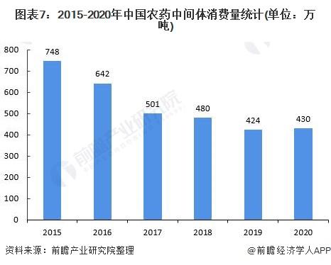 需求方面,受环保趋严影响,我国农药中间体行业景气度不高。2015-2020年,我国农药中间体消费量呈下降态势。2020年,全国农药产量为214.8万吨,对应中间体消费量约为430万吨。